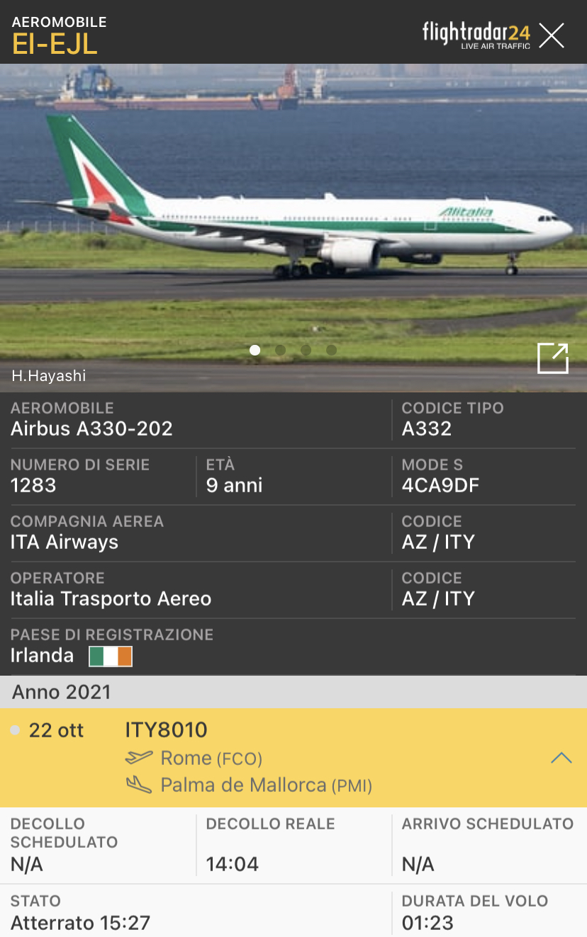 compagnie aeree ITA Airways : A330/200 trasferito a Palma de Mallorca Pubblicato da Italiavola il 24 ottobre 2021 Secondo quanto riporta Flightradar24, ieri pomeriggio alle 14:04 e’ decollato da Roma FCO un A330-202 EI-EJL come ITY8010 con destinazione Palma de Mallorca. L’atterraggio e’ avvenuto alle 15:27. Condividi: Condividi su Facebook (Si apre in una nuova finestra) Facebook Share on LinkedIn (Si apre in una nuova finestra) LinkedIn Condividi su Reddit (Si apre in una nuova finestra) Reddit Share on Pinterest (Si apre in una nuova finestra) Pinterest Condividi su Tumblr (Si apre in una nuova finestra) Tumblr Condividi su X (Si apre in una nuova finestra) X Mi piace Caricamento... Correlati