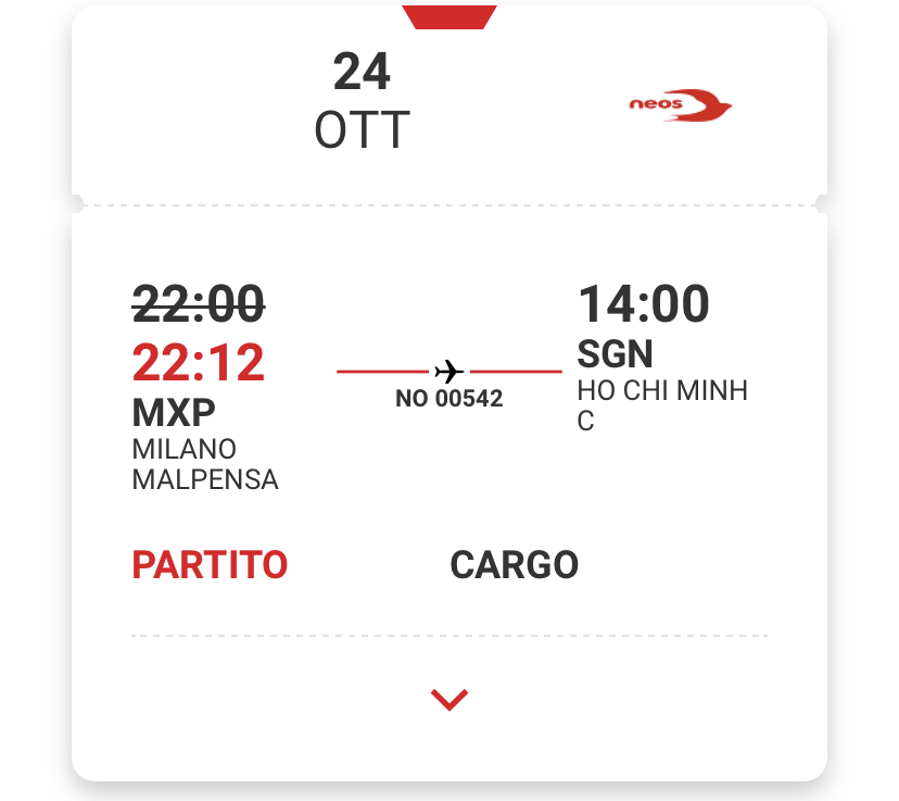 compagnie aeree Neos vola a Ho Chi Minh City Pubblicato da Italiavola il 24 ottobre 2021 L’ex Saigon e’ la destinazione di questa sera di questo B787-9 EI-NYE della Neos. E’ diretto in Vietnam il volo NO542 Milano Malpensa – Ho Chi Minh City non annotato da Flightradar24 , ma compare nell’orario dell’aeroporto di Milano Malpensa. Condividi: Fai clic per condividere su Facebook (Si apre in una nuova finestra) Facebook Fai clic qui per condividere su LinkedIn (Si apre in una nuova finestra) LinkedIn Fai clic qui per condividere su Reddit (Si apre in una nuova finestra) Reddit Fai clic qui per condividere su Pinterest (Si apre in una nuova finestra) Pinterest Fai clic qui per condividere su Tumblr (Si apre in una nuova finestra) Tumblr Fai clic per condividere su X (Si apre in una nuova finestra) X Mi piace Caricamento... Correlati