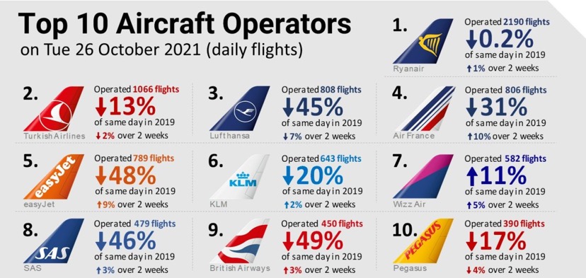 Solo Ryanair e’ praticamente stabile, -0,2%. Emblematico e’ il differenziale tra Ryanair e easyJet. Il -0,2% del vettore irlandese con il -48% di easyJet. Le altre otto variano tra il -11% di Wizz, fino al -49% della British Airways. SAS e’ al -46%.