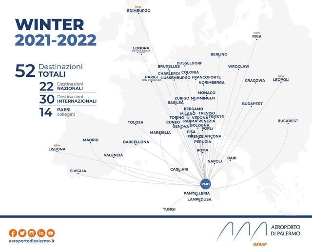 Da novembre fanno il loro ingresso nel network palermitano rotte come Lisbona (primo volo in assoluto che dal 2 novembre collegherà la Sicilia con il Portogallo); Edimburgo, in Scozia; Leopoli (Lviv), in Ucraina; Riga, in Lettonia. In particolare:22 rotte nazionali: Ancona, Napoli, Bari, Cagliari, Roma Fiumicino, Firenze, Pisa, Genova, Bologna, Venezia, Verona, Torino, Milano Malpensa, Milano Linate, Bergamo, Trieste, Treviso, Perugia, Cuneo, Pantelleria, Lampedusa, Forlì, Parma;4 collegamenti Francia: Parigi Orly, Tolosa, Parigi Beauvais, Marsiglia; 7 collegamenti Germania: Colonia, Francoforte e Francoforte Hann, Monaco, Norimberga, Berlino Brandeburgo, Memmingen, Dusseldorf Weeze; 4 rotte Regno Unito: Londra Stansted, Londra Gatwick, Londra Luton, Edimburgo; 5 rotte per Polonia, Romania, Ungheria, Ucraina: Cracovia, Wroclaw, Bucarest Otopeni, Budapest, Leopoli; 5 rotte Spagna, Portogallo: Madrid, Valencia, Siviglia, Barcellona, Lisbona; 1 rotta Belgio: Charleroi; 2 Svizzera: Zurigo, Basilea; 1 Lettonia: Riga; 1 Tunisia: Tunisi. “In un momento molto difficile e incerto per il settore aereo – dice Giovanni Scalia, amministratore delegato di Gesap – intravediamo una robusta ripresa del traffico passeggeri e voli grazie all’intensa cooperazione con le compagnie aeree, che mettono Palermo sempre più al centro dei loro progetti di ripartenza”