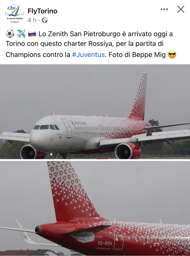 A Torino per il match tra Juventus e Zenith San Pietroburgo e’ arrivato un A319/100 Rossya.