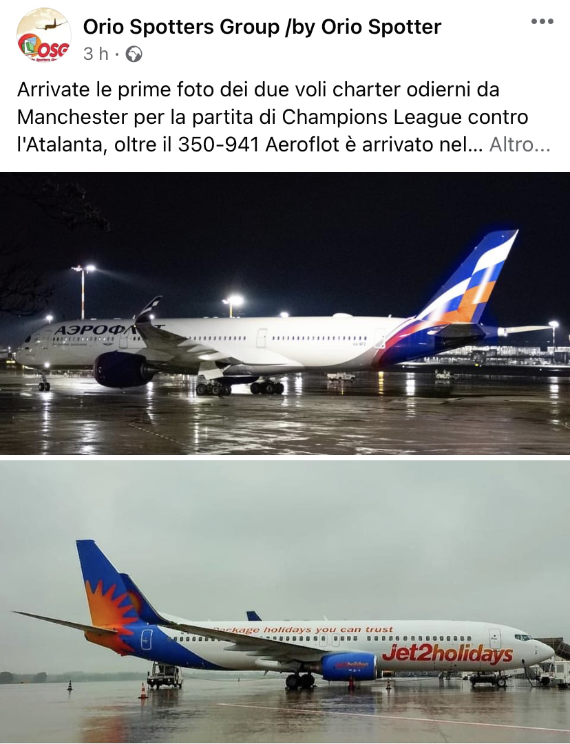 Grazie agli spotters di Bergamo e Torino possiamo documentare che sull’aeroporto orobico per la trasferta del Manchester United contro l’Atalanta Bergamasca Calcio e’ arrivato un A350-941 Aeroflot e un B737/800 Jet2.com