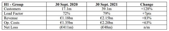 I ricavi programmati del primo semestre sono aumentati del 61% a 1,27 miliardi di euro, poiché il traffico è aumentato del 128% da 17,1 milioni a 39,1 milioni (a un fattore di carico del 79%). L’interruzione Covid del traffico di Pasqua, il ritardato allentamento delle restrizioni di viaggio dell’UE a maggio/giugno e l’incertezza causata dal confuso sistema di semafori del Regno Unito quest’estate e la natura ravvicinata delle prenotazioni hanno richiesto uno stimolo dei prezzi, con conseguenti tariffe medie di appena 33€ (in calo del 30% rispetto al primo semestre dello scorso anno). Le entrate accessorie hanno continuato la loro forte performance, generando oltre € 22,50 per passeggero, poiché gli ospiti scelgono l’imbarco prioritario e i posti riservati. I ricavi totali sono aumentati di oltre l’80% a 2,15 miliardi di euro nel primo semestre.