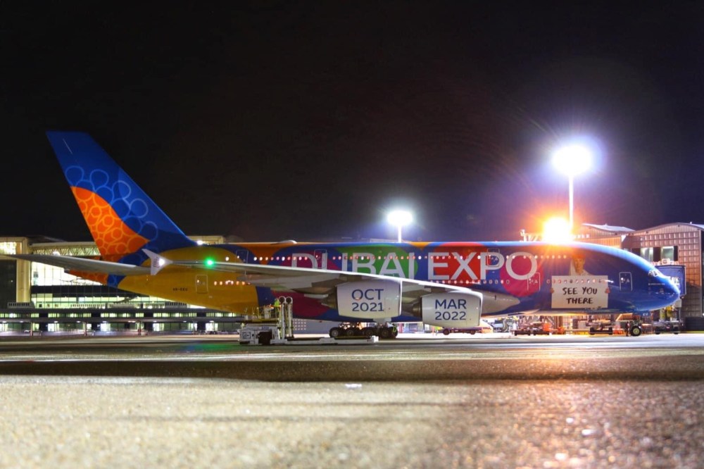 Il giorno dopo che l’A380-800 e’ ritornato a volare tra Dubai e Milano Malpensa, Emirates ha inviato il coloratissimo ”Dubai Expo”. La durata della esposizione e’ indicata sulle nacelles dei motori. L’aereo e’ stato cosi colorato per la manifestazione aperta da poco piu’ di un mese ed e’ stato creato come strumento promozionale.