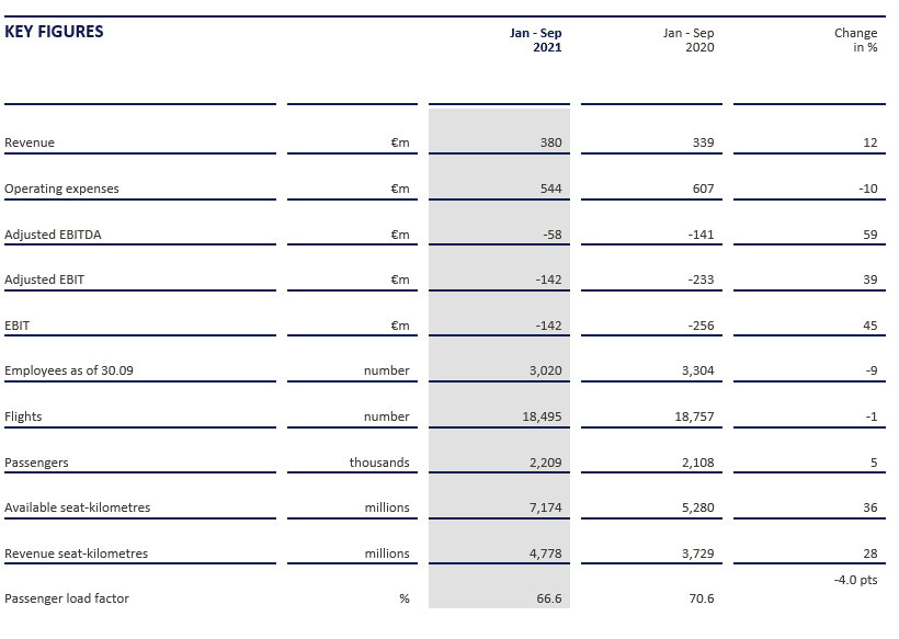 L’EBIT rettificato nei primi nove mesi è stato di -142 milioni di euro (anno precedente: -233 milioni di euro); Anche l’EBIT del periodo in esame è stato di -142 milioni di euro (anno precedente: -256 milioni di euro), con il dato dell’anno precedente gravato da svalutazioni di aeromobili e diritti d’uso per aeromobili pari a 31 milioni di euro.
