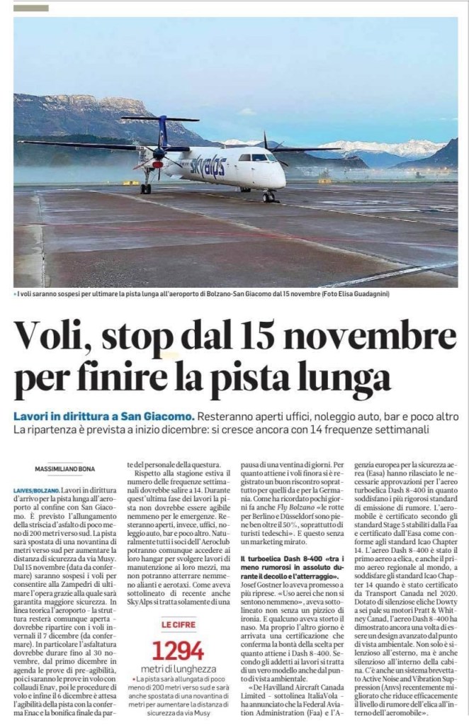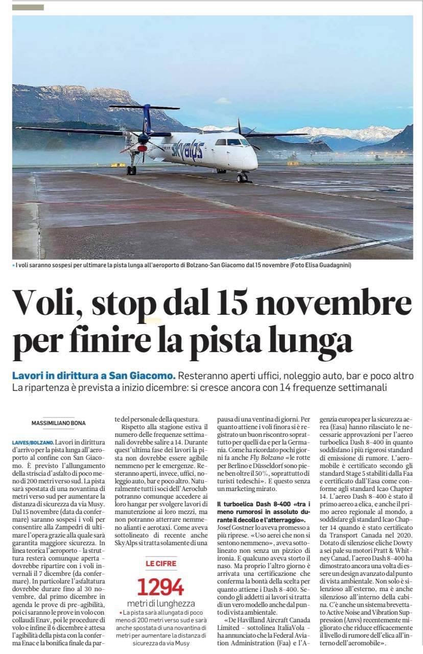 L’articolo principalmente tratta il fatto della imminente chiusura dello scalo altoatesino per i noti lavori di conclusione dell’allungamento della pista di volo. Infatti la Ditta Zampedri cosi concludera’ le opere che porteranno la pista di volo di Bolzano di passare dai 1294 metri attuali a poco piu’ di 1400, con un allungamento di meno di 200 metri, come scrive il quotidiano. I lavori si dovrebbero completare il 30 novembre, per poi passare ai collaudi il giorno dopo e quindi le ultime necessita’ burocratiche. L’intenzione e’ di riprendere l’attivita’ di volo per il 7 dicembre.