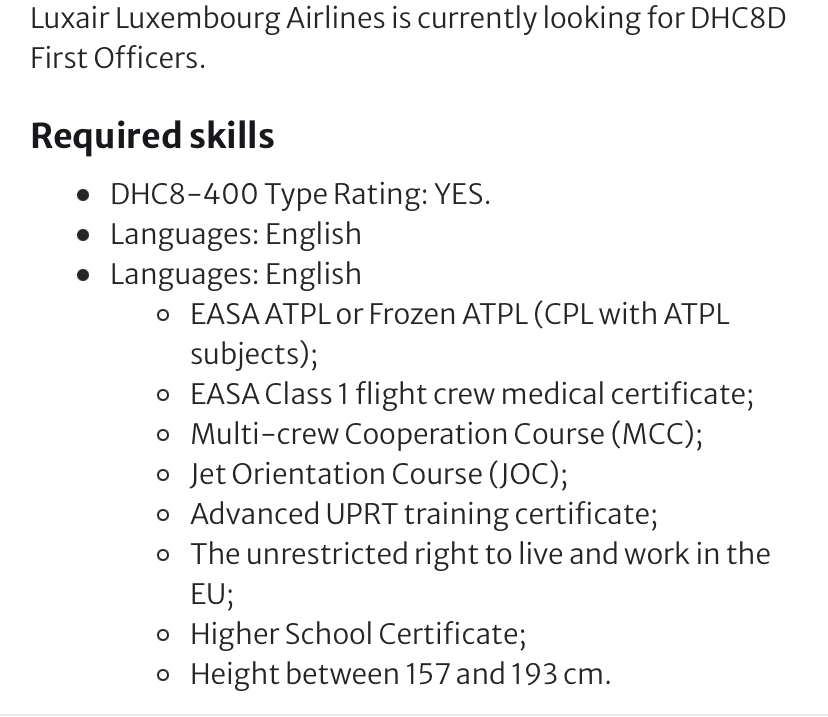 La compagnia lussemburghese sta cercando primi ufficiali per il De Havilland of Canada DHC-8/Q400 gia’ con il type rating sull’aeromobile.