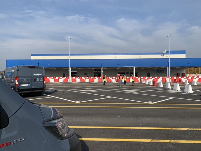 i quali ricevono i prodotti da consegnare da aree dedicate e identificate da colori e QR-CODE. Nella foto sopra e invece sotto c’e’ la tettoia esterna al deposito dove sostano i mezzi che ricevono i plichi da consegnare.