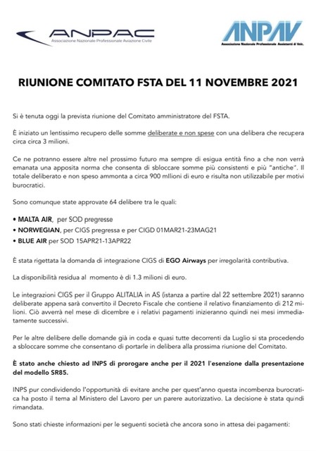 Non sta tanto bene il trasporto aereo italiano. Questa volta non parliamo dell’andamento del traffico, ma della condizione dei vettori per quanto riguarda gli stati di crisi. Ieri c’e’ stata la riumione del comitato FSTA e grazie a questo documento pubblico di Anpac / Anpac in quanto presente sulla pagina Facebook di Anpav.