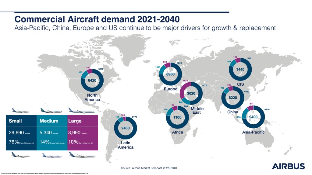 Nei prossimi 20 anni, Airbus prevede che la domanda di trasporto aereo si sposterà progressivamente dalla crescita della flotta al ritiro accelerato di aeromobili più vecchi e meno efficienti dal punto di vista dei consumi, determinando la necessità di circa 39.000 passeggeri di nuova costruzione e aerei da carico, 15.250 di questi per la sostituzione. Di conseguenza, entro il 2040 la stragrande maggioranza degli aeromobili commerciali in servizio sarà di ultima generazione, rispetto all’attuale 13% circa, migliorando notevolmente l’efficienza in termini di CO2 delle flotte di aeromobili commerciali mondiali. I vantaggi economici dell’aviazione si estendono oltre il settore, contribuendo per circa il 4% al PIL globale annuo e sostenendo circa 90 milioni di posti di lavoro in tutto il mondo.