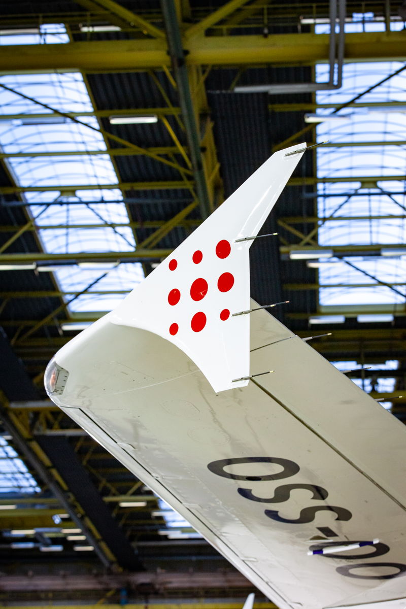 La nuova identità del marchio include una nuova versione dei colori rosso e blu caratteristici di Brussels Airlines, ora un rosso più profondo e una tonalità di blu più scura. La “b” tratteggiata, che oggi adorna le code della sua flotta, lascia il posto a 9 punti di diverse dimensioni a forma di quadrato, per rappresentare la diversità dei suoi clienti, delle sue destinazioni e dei suoi dipendenti. Nessun punto è uguale. Il logo aggiornato utilizza anche un nuovo carattere di tipo più moderno. Le due parole del marchio sono ora sovrapposte, con la parola “bruxelles” che acquista maggiore importanza con le sue dimensioni maggiori per sottolineare l’identità belga della compagnia aerea. La nuova livrea del velivolo, mostra uno zoom sul logo punteggiato sulle code, una fresca carrozzeria bianca e una continuazione di puntini in diverse tonalità di blu e grigio.