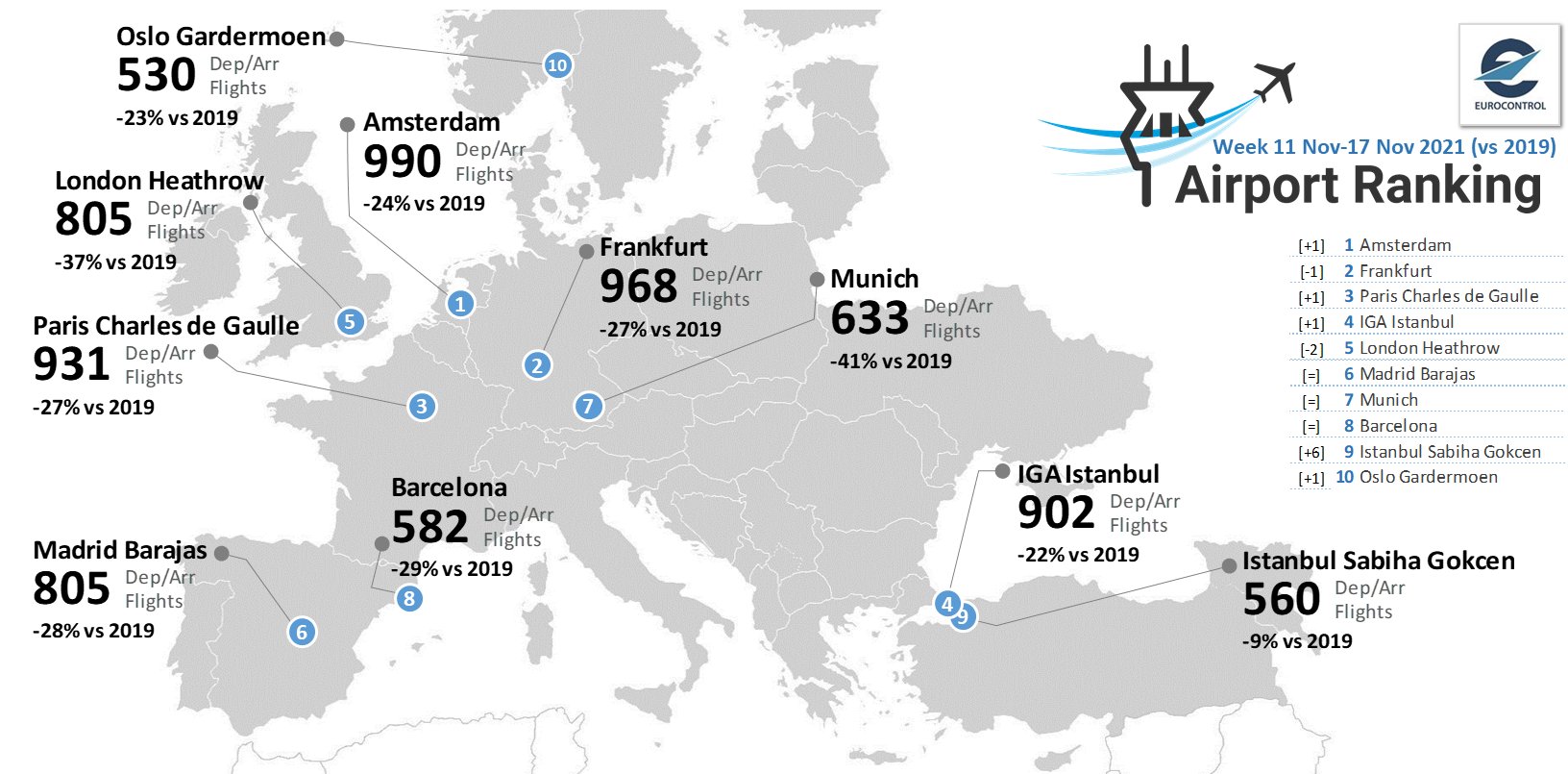 I dati sono di Eurocontrol, l’aeroporto con un incidenza piu’ bassa e’ Istanbul Sabiha Gokcen con il -9%. Quello piu in difficoltà dei dieci e’ Monaco con il -41%.