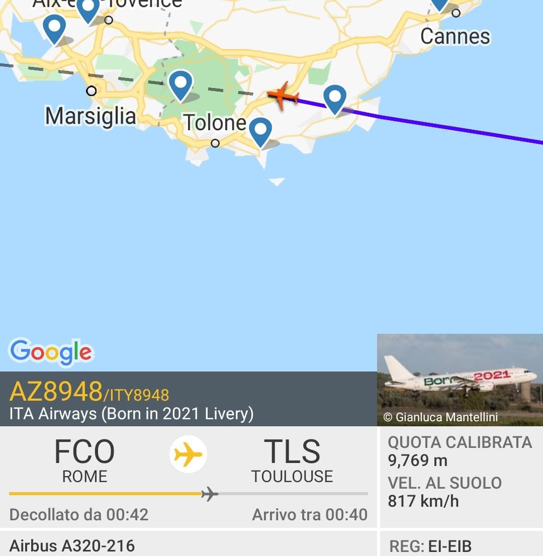 Questa mattina il velivolo”Born in 2021”, l’A320-216 EI-EIB e’ partito da Roma Fiumicino come AZ8948 per Tolosa.