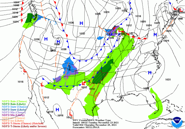Mappa delle previsioni del tempo per giovedì 25 novembre 2021 (giorno del Ringraziamento):
