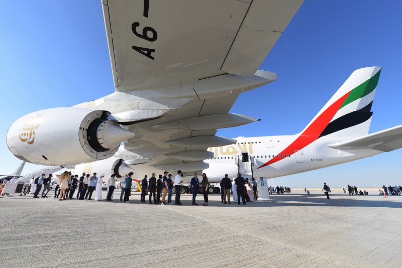 Emirates ha contribuito ad aprire l’esibizione di volo del primo pomeriggio dell’airshow con uno speciale fly past composto da un Airbus A380 e il Boeing 777 adornati con le speciali livree UAE 50th ed Expo 2020 Dubai, affiancati dalle compagnie aeree commerciali partner degli Emirati Arabi Uniti, e seguiti da la squadra di visualizzazione aerea degli Emirati Arabi Uniti, Al Fursan.