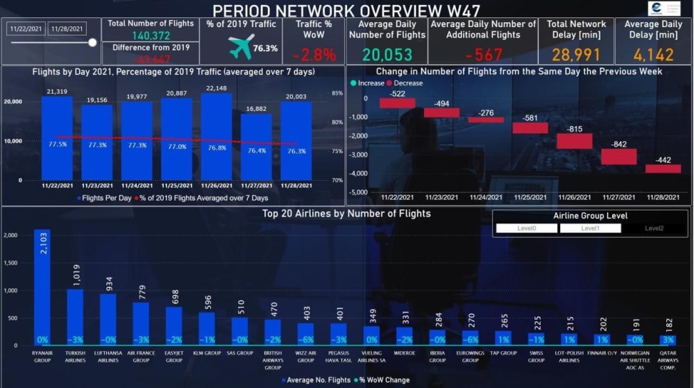 Tra le compagnie aeree presenti nel grafico Ryanair ha una media di 2103 voli al giorno con un valore di riferimento percentuale dello 0%. Stessa cosa per SAS, Vueling, Iberia e Norwegian. TAP aumenta con un piu 1% e Qatar Airways con un piu’ 3%. Sotto zero e cioe’ in perdita le altre del gruppo di 20 prese in esame.