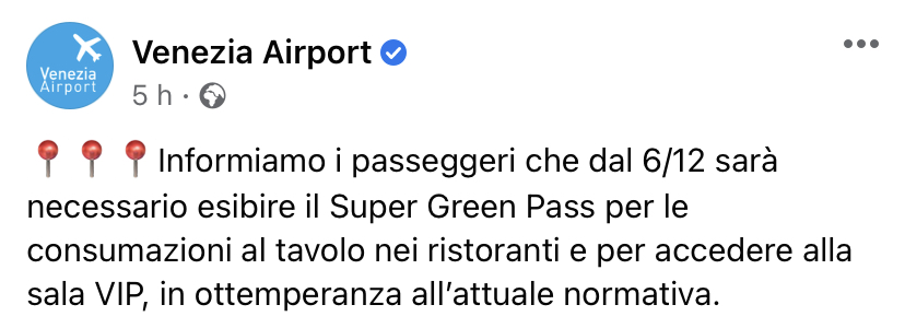 compagnie aeree Super Green Pass: servira’ negli aeroporti dal 6/12 per lounge e consumazioni nei ristoranti Pubblicato da Italiavola il 3 dicembre 2021 Nuove obbliganze con il Super Green Pass. A partira dal 6/12 sara obbligatorio negli aeroporti per le consumazioni al tavolo nei ristoranti e per accedere alla sala VIP. Condividi: Fai clic per condividere su Facebook (Si apre in una nuova finestra) Facebook Fai clic qui per condividere su LinkedIn (Si apre in una nuova finestra) LinkedIn Fai clic qui per condividere su Reddit (Si apre in una nuova finestra) Reddit Fai clic qui per condividere su Pinterest (Si apre in una nuova finestra) Pinterest Fai clic qui per condividere su Tumblr (Si apre in una nuova finestra) Tumblr Fai clic per condividere su X (Si apre in una nuova finestra) X Mi piace Caricamento... Correlati