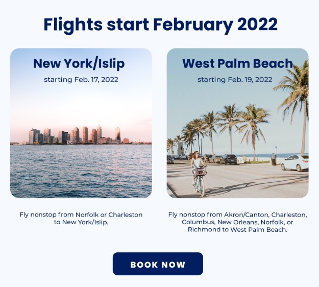 Da Islip (ISP), Breeze volerà a Charleston e Norfolk.