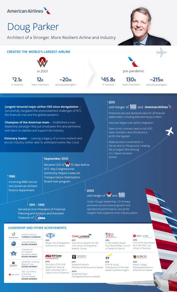 Parker ha aggiunto: “È stato il privilegio della mia vita servire per 20 anni come CEO di una compagnia aerea. Sono eternamente grato al team americano, il cui impegno nel prendersi cura gli uni degli altri e dei nostri clienti non ha mai vacillato e continuerà a guidare il nostro successo in futuro”.