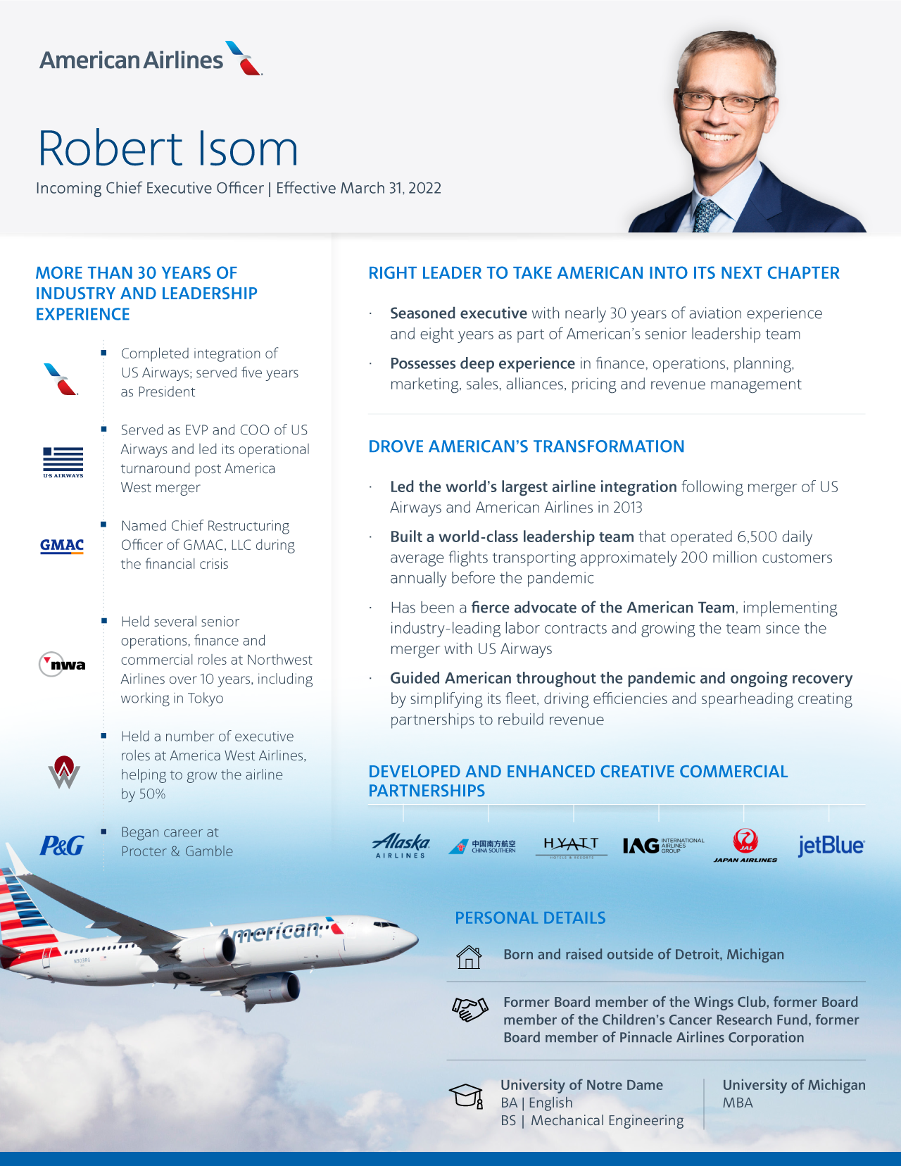 “Lavoro con Robert da due decenni e sono incredibilmente contento che sarà il prossimo CEO di American Airlines, che è davvero il miglior lavoro nel nostro settore”, ha affermato Parker. “Robert è un leader collaborativo con una profonda competenza operativa ed esperienza nel settore globale. I suoi sforzi per guidare e supportare il nostro team durante la pandemia sono stati a dir poco fenomenali. Siamo ben posizionati per trarre il massimo vantaggio dalla ripresa del nostro settore e ora è il momento giusto per un passaggio di consegne che abbiamo pianificato e preparato. Mi sento estremamente fortunato a lasciare le redini a questo leader chiaro e capace”.