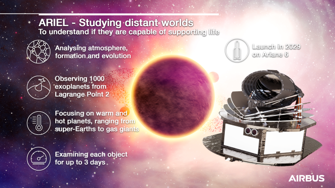 Dalla prima osservazione nel 1995 sono stati identificati più di 5.000 esopianeti, ma si sa poco sulla composizione chimica delle loro atmosfere. Le missioni di scienza spaziale esistenti stanno fornendo risultati sugli esopianeti (come CHEOPS per l’ESA costruito da Airbus), ma Ariel sarà la prima missione dedicata allo studio delle atmosfere di un gran numero di esopianeti, inclusa la determinazione dei principali componenti atmosferici e la caratterizzazione delle nuvole. Le osservazioni di questi mondi forniranno approfondimenti sulle prime fasi della formazione planetaria e atmosferica e sulla loro successiva evoluzione, contribuendo a loro volta alla comprensione del nostro Sistema Solare. Potrebbero aiutarci a scoprire se c’è vita altrove nel nostro universo e se c’è un altro pianeta come la Terra.