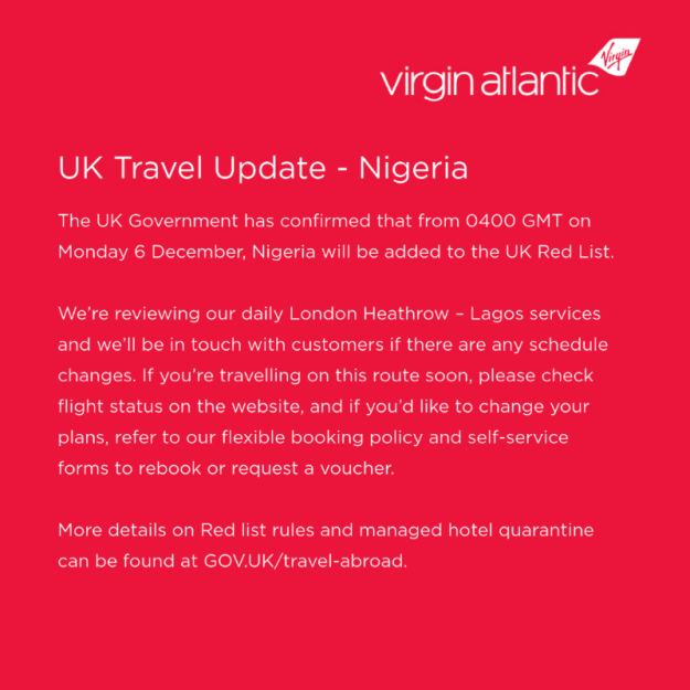 In altre notizie, oggi, 6 dicembre, il governo del Regno Unito ha aggiunto la Nigeria alla sua Lista rossa per i viaggi. Virgin Atlantic sta valutando la rotta Londra Heathrow – Lagos: