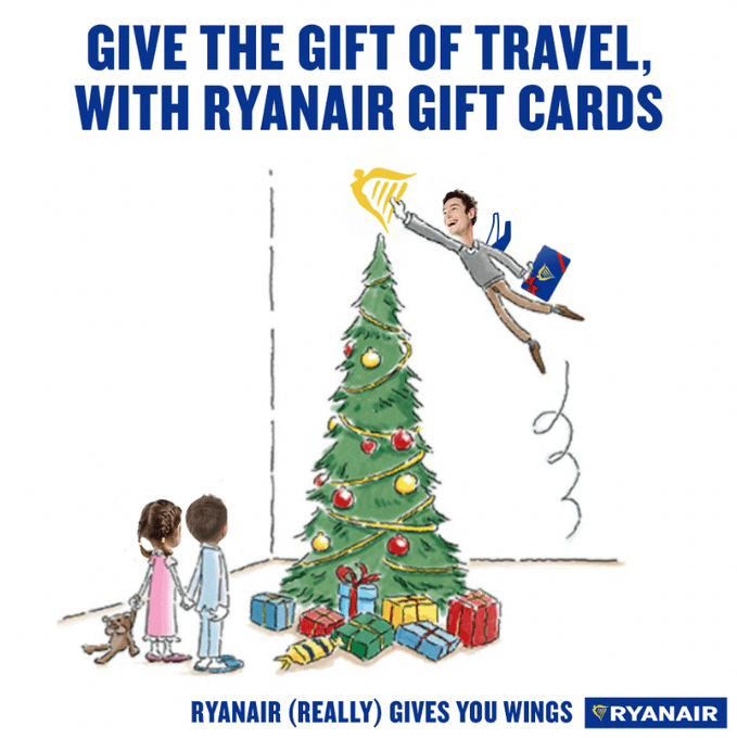 Le gift card Ryanair partono da € 25 e sono valide per viaggiare attraverso il network di rotte in continua espansione di Ryanair, quindi accedi oggi al sito web Ryanair.com per regalare un viaggio questo Natale”.