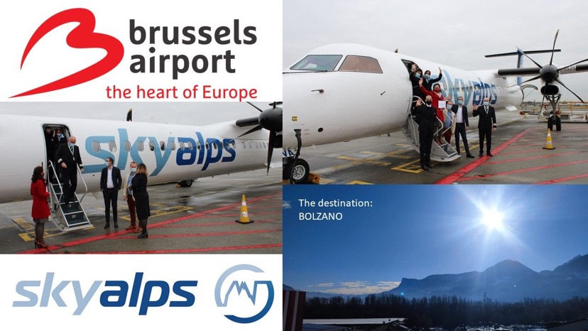 L’arrivo a Bruxelles del primo volo SkyAlps da Bolzano e’ stato festeggiato come si vede nelle due foto.