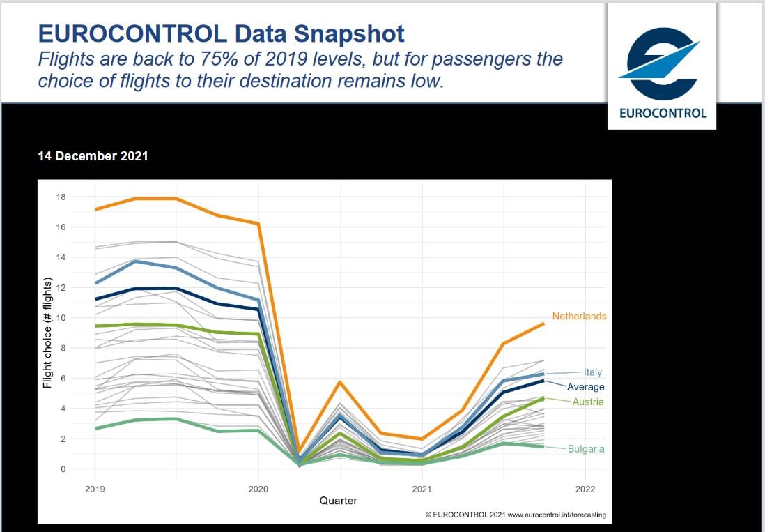 E’ un altro grafico prodotto da Eurocontrol dove si ripoorta la situazione di oggi 14 ottobre 2021. il traffico è mediamente al -25% rispetto al 2019. Ovviamnete è un valore medio dove per molti paesi ha numeri diversi. Si vede in questo grafico quanto è dfferente la forbice tra Bulgaria e Paesi Bassi. Il traffico è abbastanza ripreso, ma per i voli passeggeri c’è ancora tanto da fare, molto alto è il gap tra i paesi e la capacità rispetto al passato nella media della disponibilità di voli.