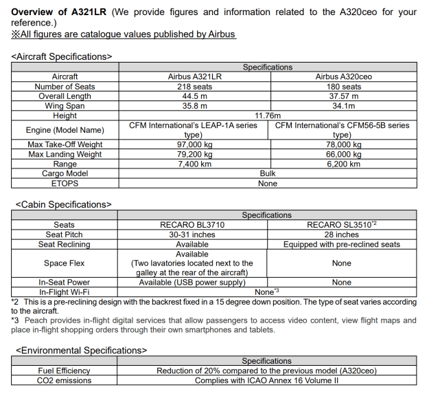 L’A321LR introdotto da Peach incorpora il motore LEAP-1A di CFM e sharklets (grandi piastre di estremità alari) ed è il 20% più efficiente nei consumi rispetto al modello precedente (A320ceo).