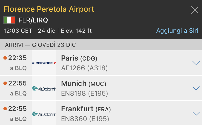 Come si legge dallo screenshot , un volo Air France da Parihi CDG con A318 e due Air Dolomiti da Francoforte e Monaco con E195 sono entrambi atterrati a Bologna.