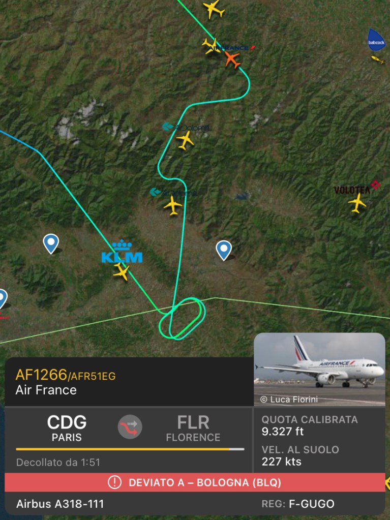 Nella foto sotto si vedono da Flightradar il volo Air France e i due aerei Air Dolomiti in sequenza verso Bologna.