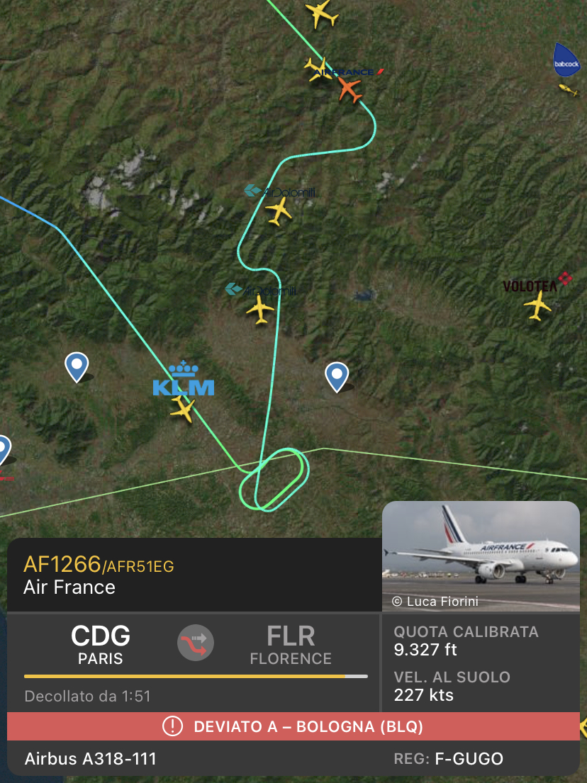 Nella foto sotto si vedono da Flightradar il volo Air France e i due aerei Air Dolomiti in sequenza verso Bologna.