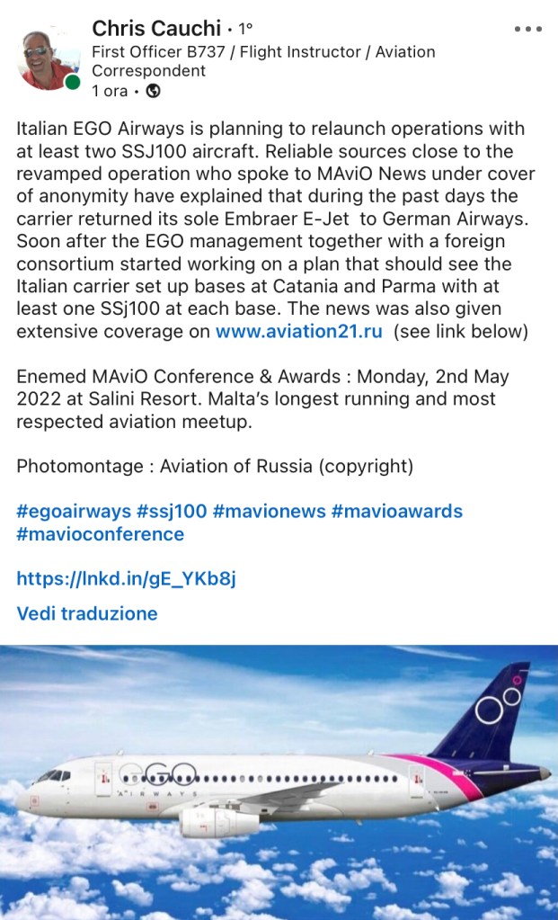 Il fotomontaggio della livrea e’ di Aviation of Russia e la notizia da http://www.aviation21.ru via Chris Cauchi. Ego Airways ha restituito l’Embraer E190 alla German Airways e per voli con base Parma e Catania. Per queste operazioni utilizzerebbe due Sukhoi Superjet SSJ100.