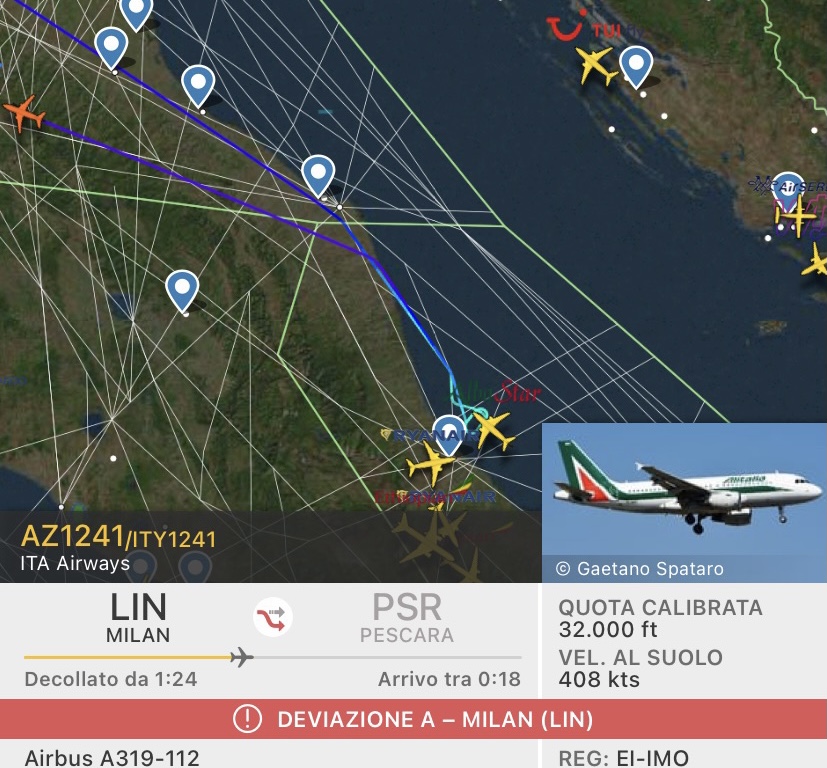 compagnie aeree Nebbia a Pescara. Volo ITA Airways ritorna a Milano Linate Pubblicato da Italiavola il 3 gennaio 2022 L’A319-112 EI-IMO ITA Airways, il quale opera il volo Milano Linate-Pescara AZ/ITY1241 a causa dello stato meteorologico sull’aeroporto abruzzese, dopo aver compiuto alcune holding sta ritornando all’aeroporto di partenza. Condividi: Fai clic per condividere su Facebook (Si apre in una nuova finestra) Facebook Fai clic qui per condividere su LinkedIn (Si apre in una nuova finestra) LinkedIn Fai clic qui per condividere su Reddit (Si apre in una nuova finestra) Reddit Fai clic qui per condividere su Pinterest (Si apre in una nuova finestra) Pinterest Fai clic qui per condividere su Tumblr (Si apre in una nuova finestra) Tumblr Fai clic per condividere su X (Si apre in una nuova finestra) X Mi piace Caricamento... Correlati