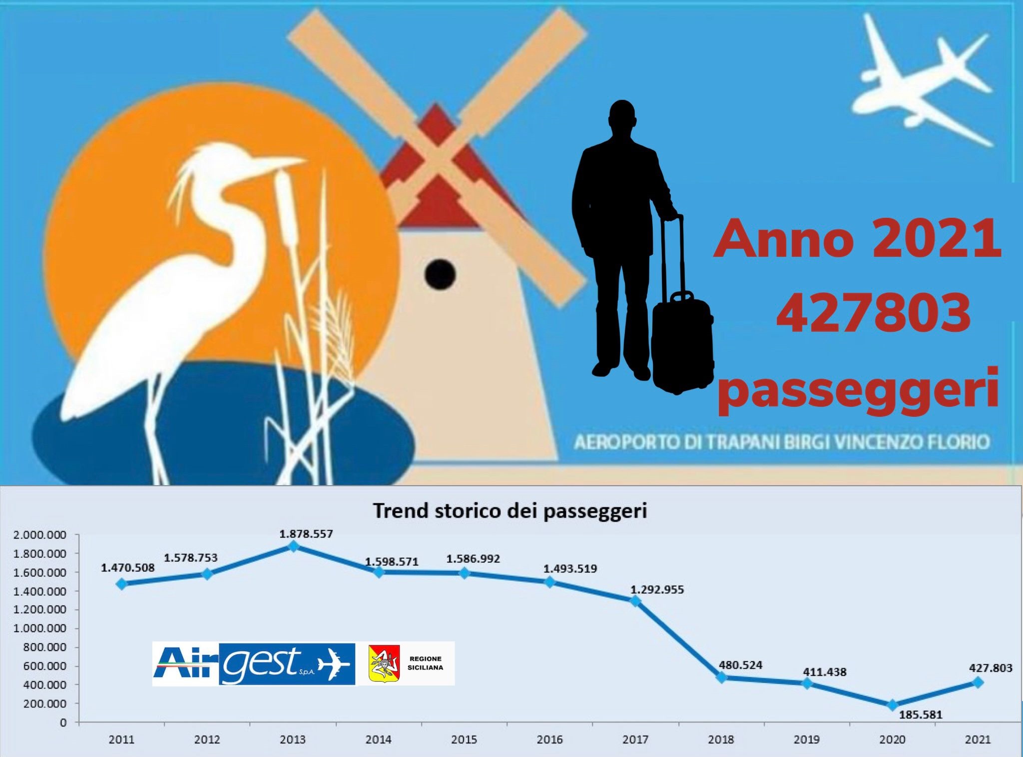 Nella storia recente dell’aeroporto di Trapani Birgi, il numero dei passeggeri ha toccato il suo apice nel 2013 con la cifra di ben 1.878.557 di passeggeri, che è scesa gradualmente fino al numero di 1.292.955 nel 2017, per poi crollare l’anno seguente fino a 480.524 e, ancora, nel 2019 a 411.438. L’anno nefasto del 2020 ha registrato solo 185.581 passeggeri e l’anno che si è concluso ha visto una risalita a 427.803.