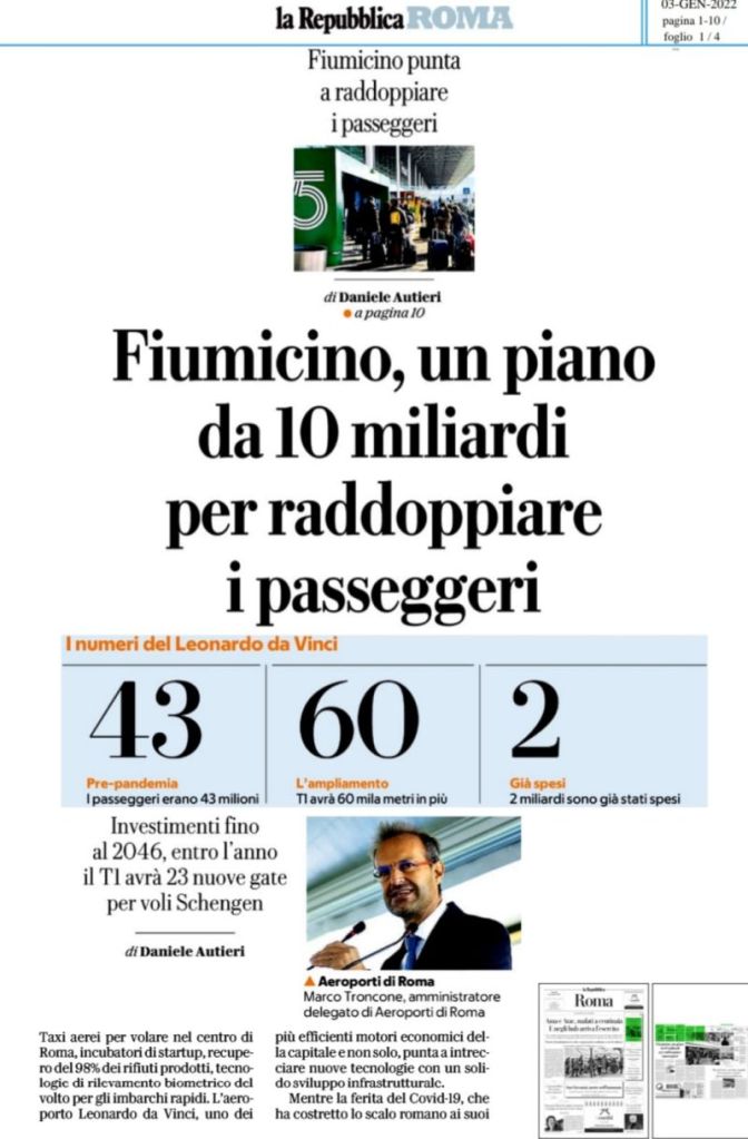 Taxi aerei per volare nel centro di Roma, incubatori di startup, recupero del 98% dei rifiuti prodotti, tecnologie di rilevamento biometrico del volto per gli imbarchi rapidi. Su La Repubblica Roma il piano di rilancio di #ADR per costruire l’aeroporto del futuro. Ne parla l’Amministratore delegato di Aeroporti di Roma, Marco Troncone, delineando gli obiettivi che puntano ad intrecciare nuove tecnologie allo sviluppo infrastrutturale.