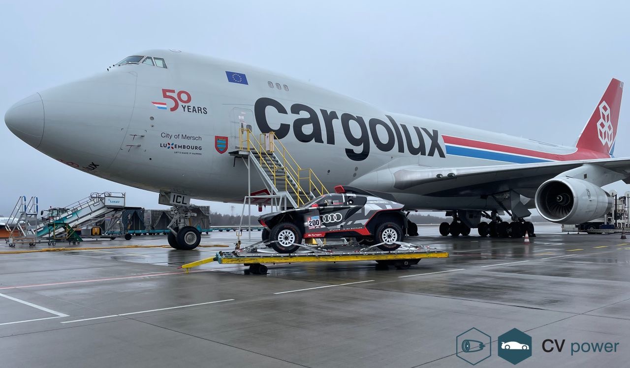 A fianco di questo B747/400F Cargolux c’e’ una delle 4 Audi RSQ E-Tron oltre a 7 tonnellate di materiali necessari a partecipare al 2022 Dakar Rallye che si correra’ in Arabia Saudita. L’aereo ha staccato le sue ruote da Lussemburgo con destinazione Riyadh. La committenza del trasporto e’ stata JAS Motosport Division, che ha operato per conto di Audi Sport & Q Motorsport GmbH.