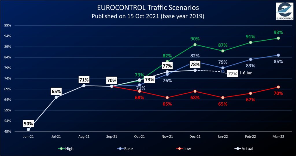 19507 aerei in un giorno di media nei primi 6 giorni di quest’anno. Tanti o pochi? Essi sono in calo, siamo al 77% rispetto ai volumi del 2019, un punto percentuale in meno rispetto al mese di dicembre 2021 e siamo posizionati tra la curv media e quella bassa. Giusto due punti in meno rispetto al valore della curva media che è stata tarata a 79%, rispetto all’82% di dicembre 2021.