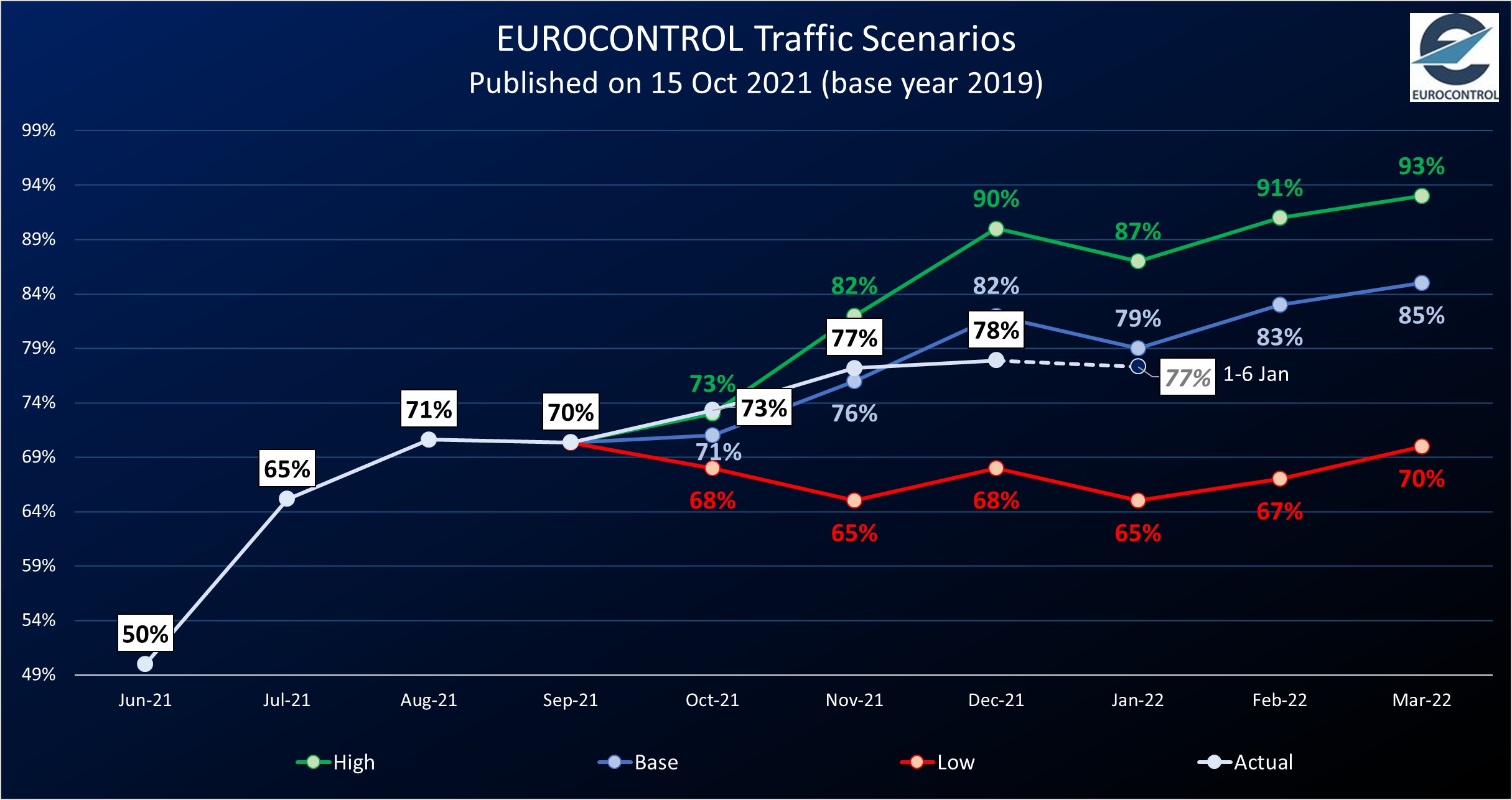 19507 aerei in un giorno di media nei primi 6 giorni di quest’anno. Tanti o pochi? Essi sono in calo, siamo al 77% rispetto ai volumi del 2019, un punto percentuale in meno rispetto al mese di dicembre 2021 e siamo posizionati tra la curv media e quella bassa. Giusto due punti in meno rispetto al valore della curva media che è stata tarata a 79%, rispetto all’82% di dicembre 2021.