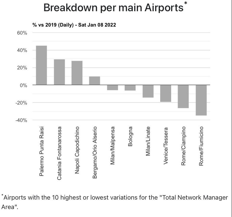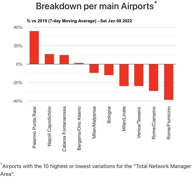 Primo sempre Palermo e Napoli che si prende il secondo posto, poi Catania che era al numero due (per il grafico del solo 8 gennaio) e Bergamo. Le percentuali medie dei sette giorni sono piu’ basse. Quindi a seguire nella parabola negativa sempre gli stessi aeroporti: Milano Malpensa, Bologna, Milano Linate, Venezia, Roma Ciampino e poi Roma Fiumicino.