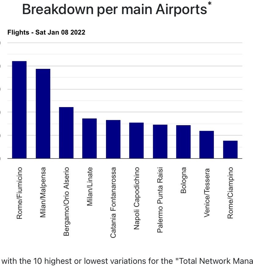 Eurocontrol e’ la fonte di questi tre grafici. Nel primo (sopra) riferito alla giornata di ieri troviamo che e’ il numero di movimenti per ciascun aeroporto.