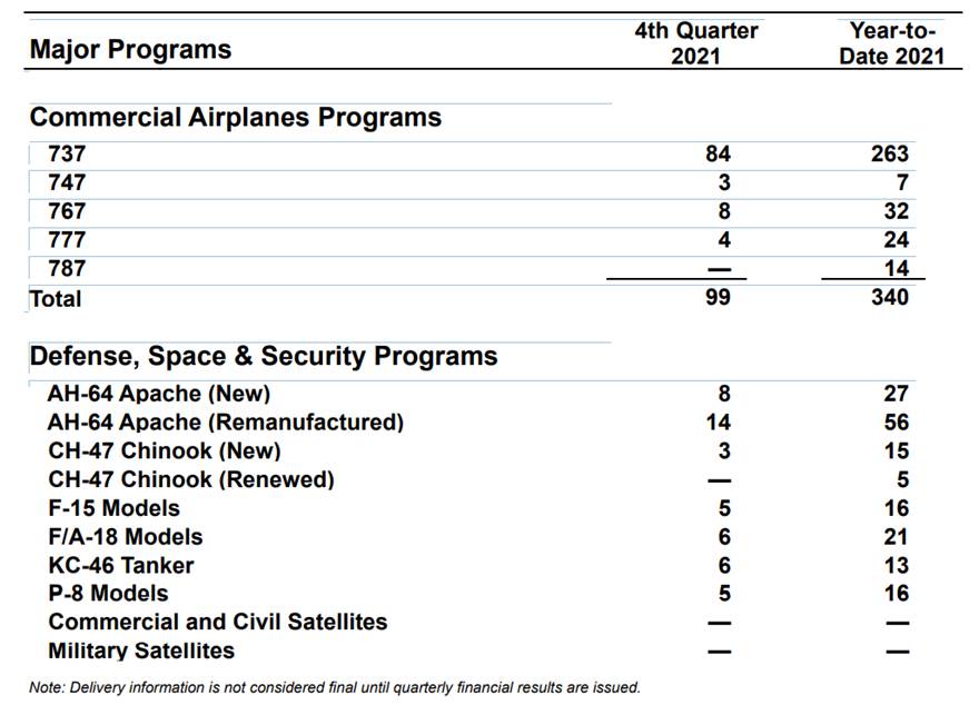 Boeing ha annunciato oggi le principali consegne relative ai suoi programmi commerciali e di difesa per il quarto trimestre 2021.L’azienda comunicherà i risultati finanziari dettagliati del quarto trimestre il 26 gennaio. Le principali consegne durante il quarto trimestre sono state le seguenti: