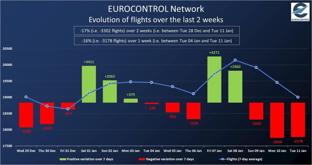 Eurocontrol nel presentare i suoi interessantissimi dati e analisi, non manca di chiamate a esempio Ryanair l’aerolinea che a livello di volumi sembra passarsela meglio e invece indica che ieri ha operato 930 voli con oltre 800 in meno rispetto a un martedi dei primi giorni di dicembre. Se questo e’ il buongiorno che si vede al mattino, c’e’ da stare poco allegri per il futuro. Pure oggi, traspare, da sentori ricevuti che i boli e gli aeroporti siano molto più vuoti rispetto al solito di un mese fa.