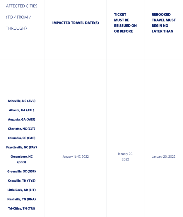 Le previsioni meteorologiche negli Stati Uniti sudorientali possono influire sul viaggio da/per/attraverso le destinazioni elencate di seguito. Controlla frequentemente lo stato del volo per informazioni aggiornate sui tuoi piani di volo, o ricevi aggiornamenti inviati direttamente sul tuo dispositivo mobile o via e-mail con One-Time Flight Notification.