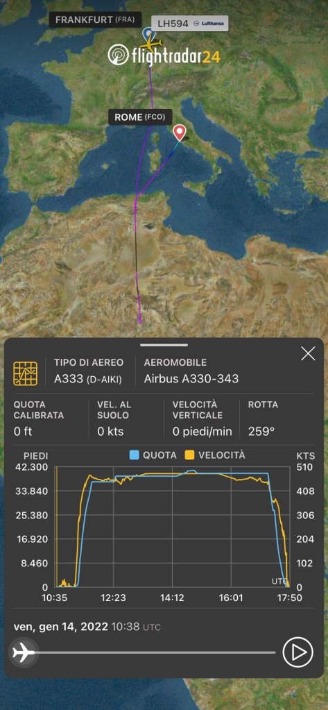 La virata a destra per ritornare verso nord e’ stata effettuata alle14:50 UTC, l’atterraggio a Roma alle 17:48UTC, dopo quasi tre ore di volo.
