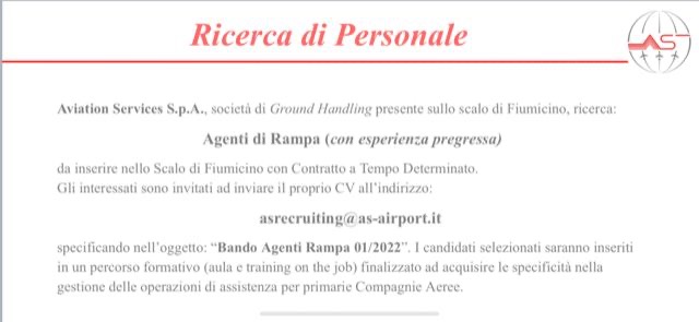 compagnie aeree Aviation Services cerca a Roma Fiumicino Pubblicato da Italiavola il 17 gennaio 2022 Ci sono posizioni aperte a disposizione a Roma Fiumicino come Agenti di Rampa (con esperienza pregressa) da Aviation Services S.p.A. Nell’immagine ci sono i riferimenti per presentare le candidature. Condividi: Fai clic per condividere su Facebook (Si apre in una nuova finestra) Facebook Fai clic qui per condividere su LinkedIn (Si apre in una nuova finestra) LinkedIn Fai clic qui per condividere su Reddit (Si apre in una nuova finestra) Reddit Fai clic qui per condividere su Pinterest (Si apre in una nuova finestra) Pinterest Fai clic qui per condividere su Tumblr (Si apre in una nuova finestra) Tumblr Fai clic per condividere su X (Si apre in una nuova finestra) X Mi piace Caricamento... Correlati