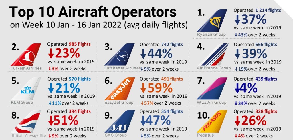 I dieci vettori top in Europa tra il 10 e il 16 gennaio mostrano una pesante sofferenza, in termini di numero di voli operati. Il crollo della domanda li ha spinti a dare una importante frenata.