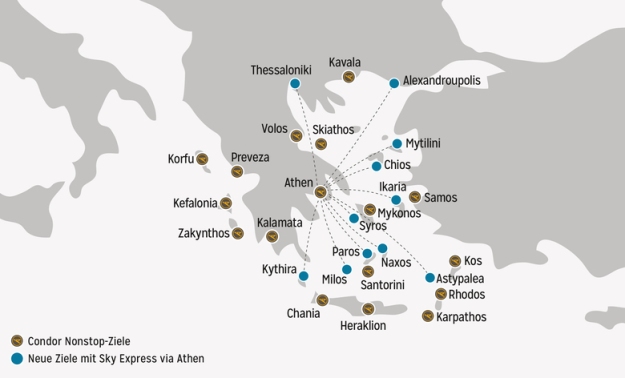Da luglio 2022, gli ospiti Condor potranno viaggiare comodamente via Atene, Rodi, Corfù e Heraklion verso le undici nuove destinazioni, comprese destinazioni popolari come Naxos, Paros e Mytilini. Dalla Germania, gli ospiti volano da Berlino, Düsseldorf, Francoforte, Amburgo, Monaco e Lipsia.