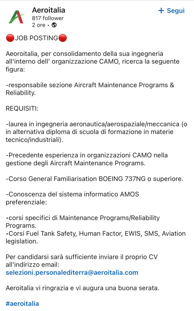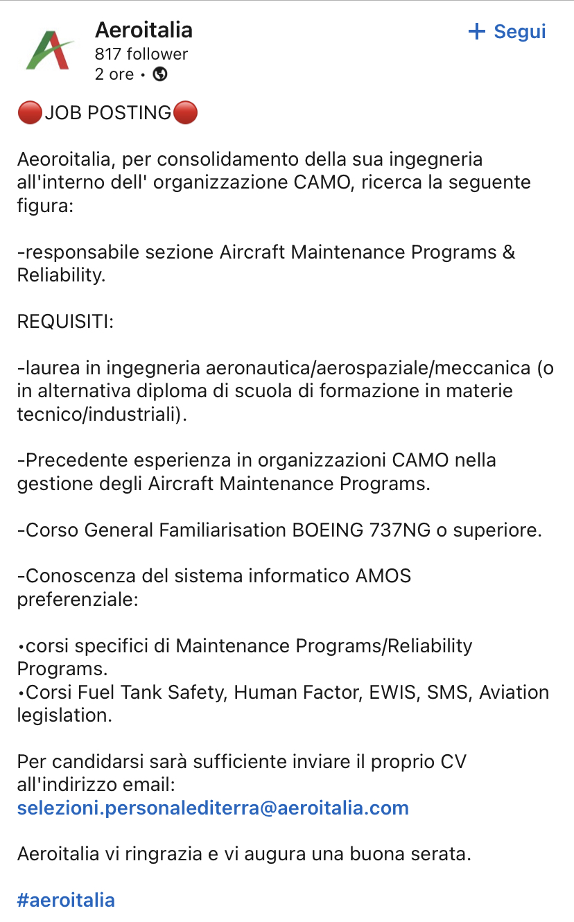Aeoroitalia, per consolidamento della sua ingegneria all’interno dell’ organizzazione CAMO, ricerca la seguente figura: